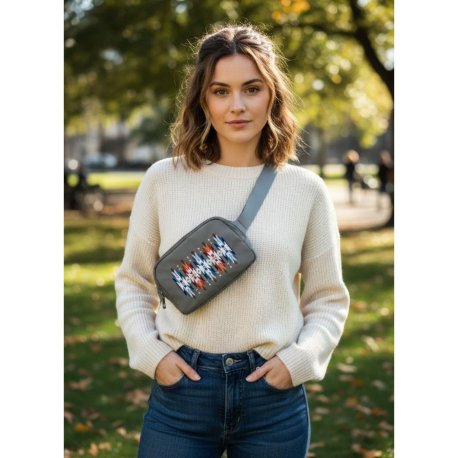 – Beautifully embroidered colorful belt bag.