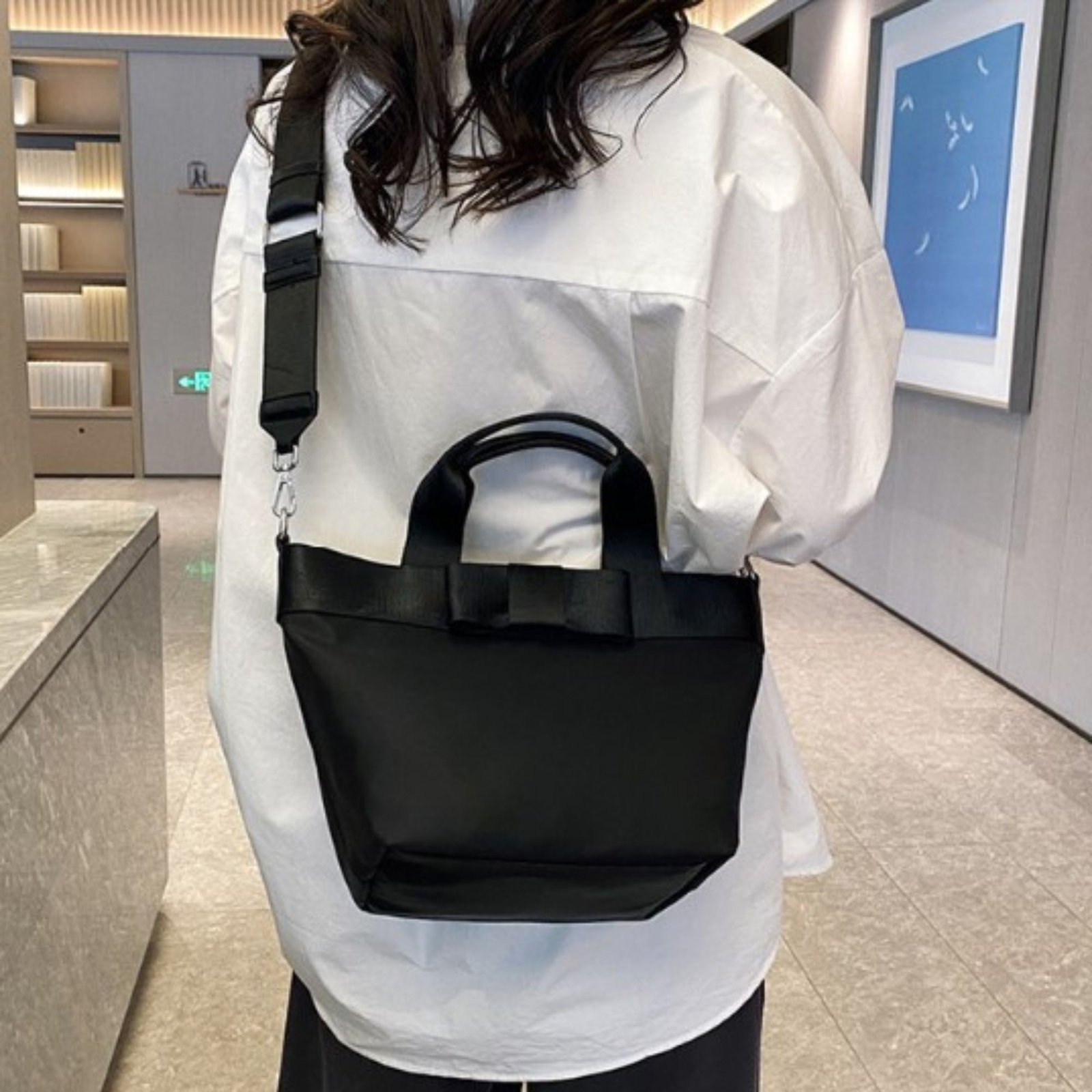 Stay effortlessly chic with the Nylon Bow Medium Tote Crossbody Bag. Crafted from lightweight nylon, this versatile and stylish bag is perfect for casual occasions.